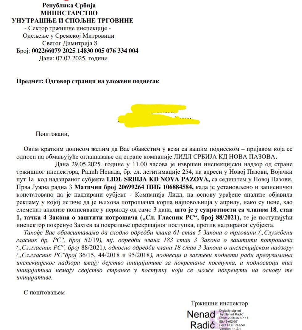 Pozivamo sve potrošače da ovo prijave Tržišnoj inspekciji na mejl podnesiprijavu@must.gov.rs i trzisna.inspekcija@must.gov.rs, kako bi se Lidlu izrekao što veći broj novčanoh kazni.